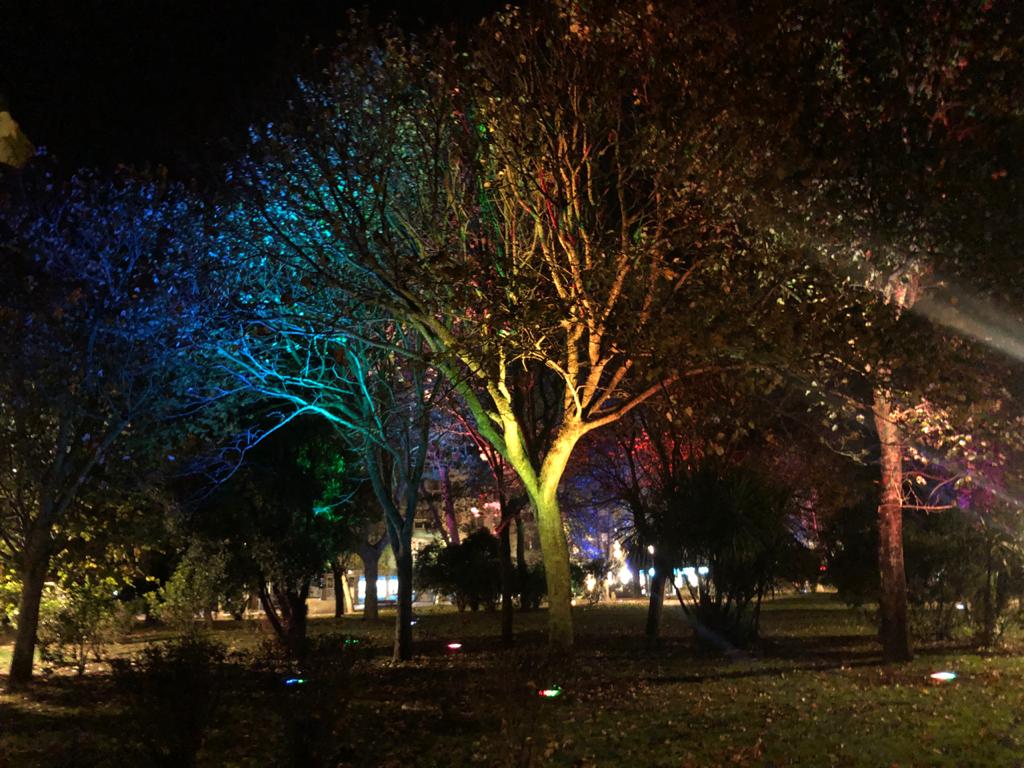 一般采用功率大,亮度高的大功率地埋燈,將其鑲嵌于樹木周邊,進而起到隱蔽安裝,照亮樹木的一種照明手法。
